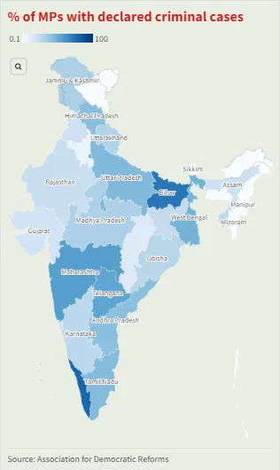 राजनीति का अपराधीकरण केवल केंद्र स्तर की राजनीति तक सीमित नहीं रहा। अब इसके दायरे में राज्यों की विधानसभाओं के साथ-साथ स्थानीय निकायों की राजनीति भी आ गई है। गौर करनेवाली बात यह है कि इसकी चपेट से न तो उत्तर भारत अछूता रहा है और न ही दक्षिण भारत। एडीआर की रिपोर्ट के मुताबिक केरल के 79 प्रतिशत, बिहार के 73 प्रतिशत, महाराष्ट्र के 57 प्रतिशत, तेलंगाना के 54 प्रतिशत और दिल्ली के 50 प्रतिशत सांसदों के ऊपर आपराधिक मुकदमे दायर किए हुए हैं। नीचे दी गई तस्वीर को देखिए, इसमें राज्य के कुल सांसदों में आपराधिक पृष्ठभूमि के सांसदों के प्रतिशत को दर्शाया है।
