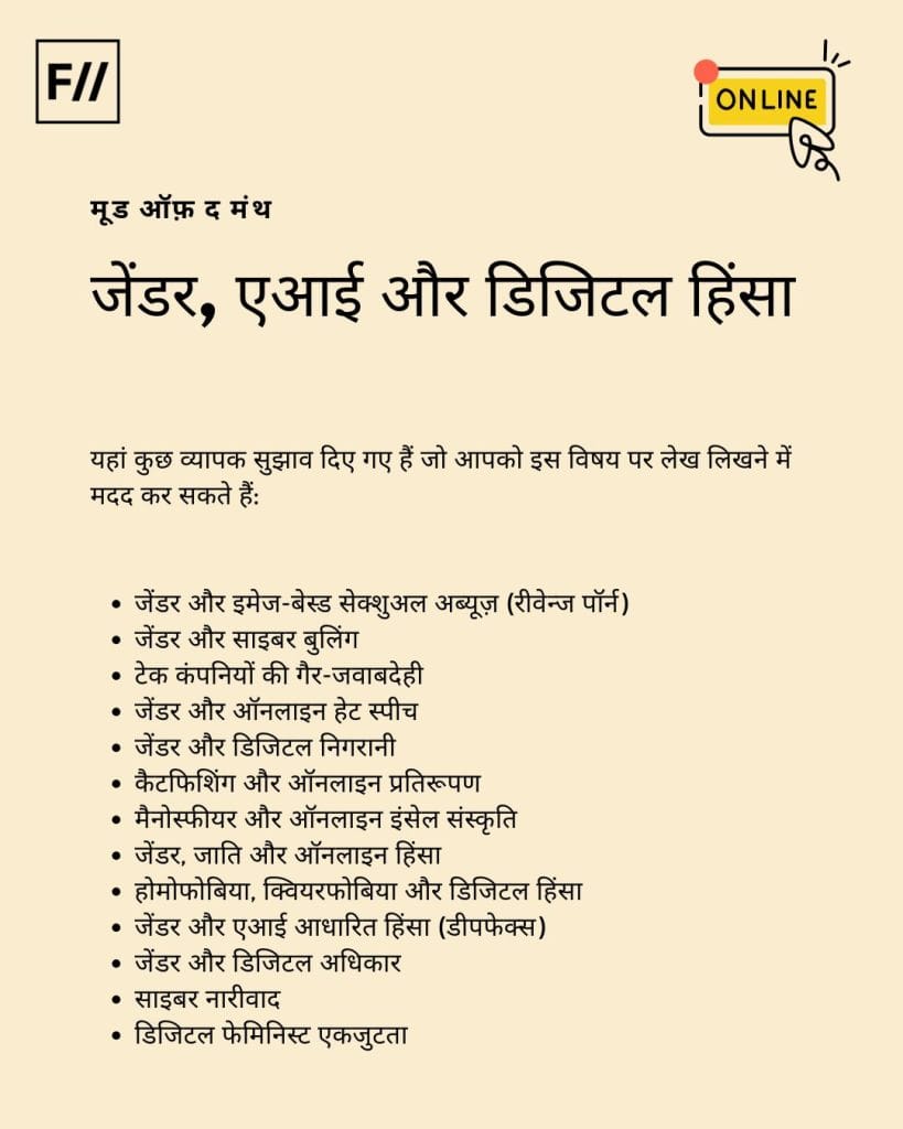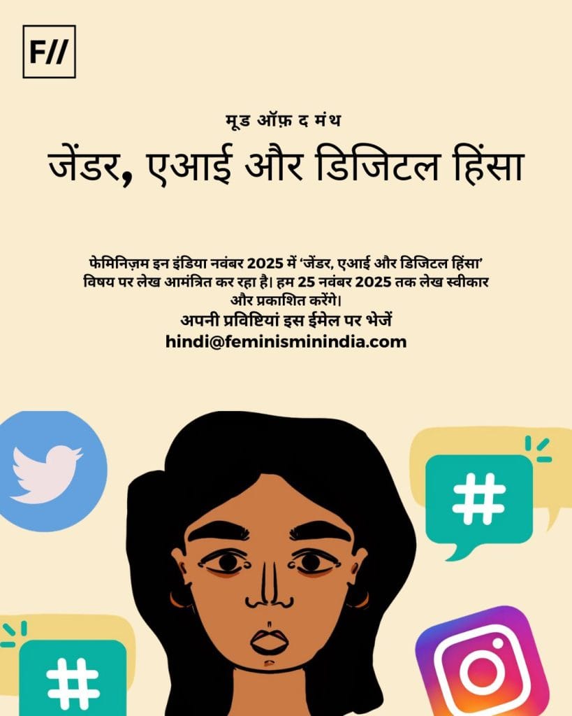 इस मुद्दे पर व्यापक विमर्श को आगे बढ़ाने के लिए फेमिनिज़म इन इंडिया नवंबर 2025 में ‘जेंडर, एआई और डिजिटल हिंसा’ विषय पर लेख आमंत्रित कर रहा है। हम 25 नवंबर 2025 तक लेख स्वीकार और प्रकाशित करेंगे।