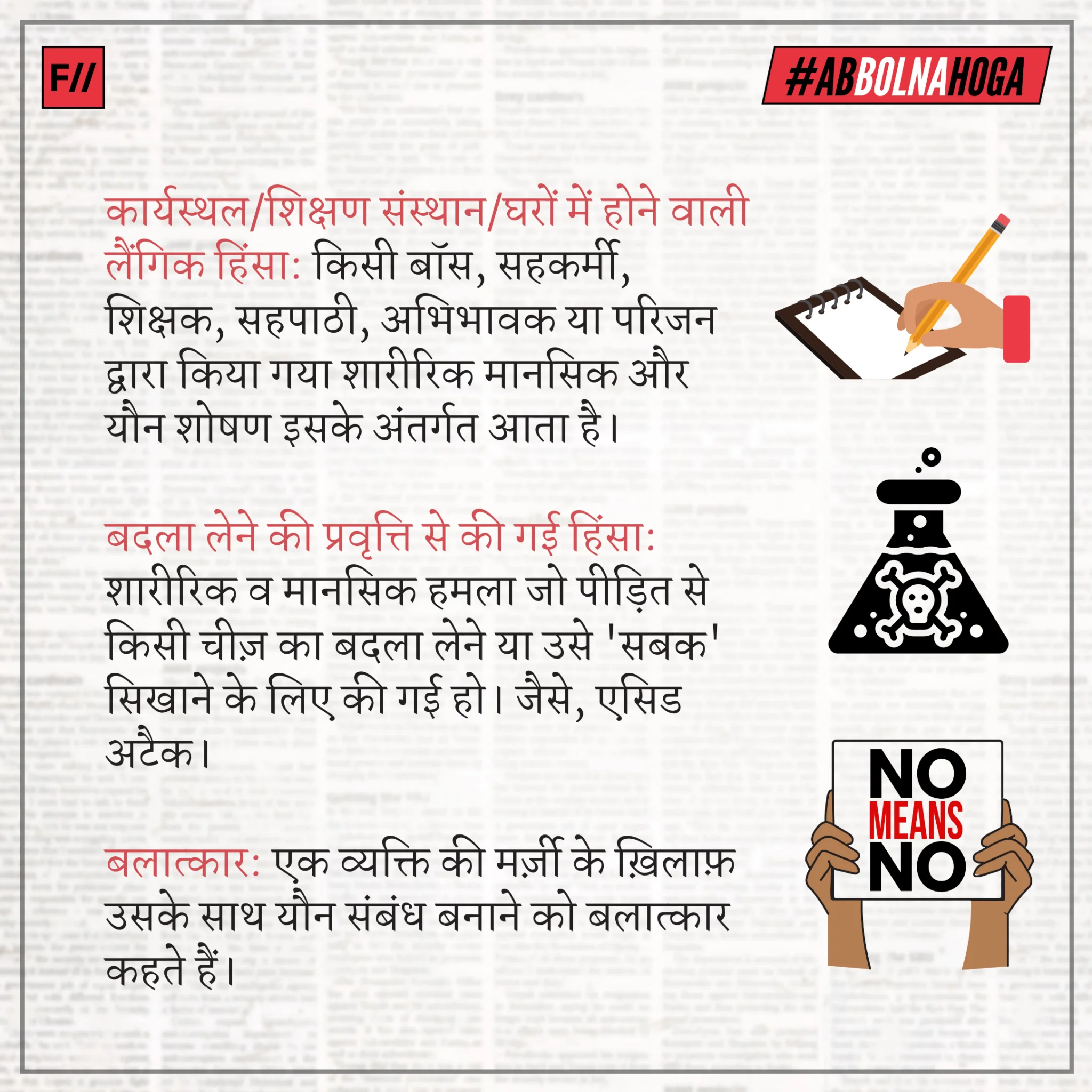 फेमिनिज़म इन इंडिया ने ऑफलाइन और ऑनलाइन लैंगिक हिंसा के अपने इस अभियान #AbBolnaHoga की शुरुआत 3 अगस्त 2020 से की है। इस अभियान के तहत अब तक हमने अपने अपने लेख, वीडियो और पोस्टर्स के ज़रिए ऑनलाइन और ऑफलाइन लैंगिक हिंसा पर लोगों के अंदर बुनियादी समझ विकसित करने की कोशिश की है जो हमारी वेबसाइट और सोशल मीडिया प्लैटफॉर्म्स पर उपलब्ध हैं।